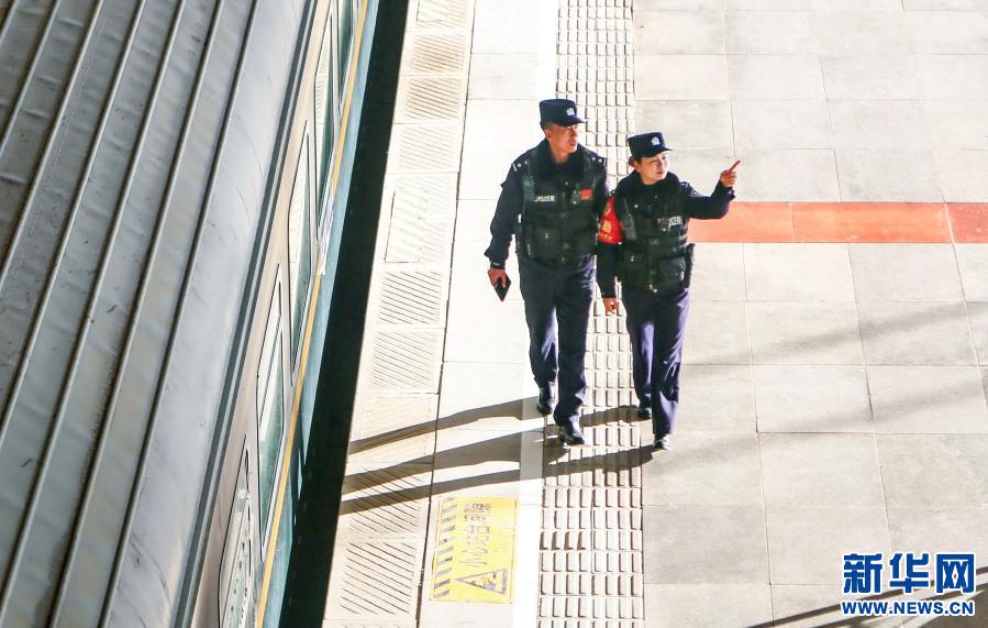 1月10日,“女子格桑花”警組民警雷穎君(右)與同事在火車站里巡邏。新華社發(fā)(胡安鵬、黃飛攝影報(bào)道)