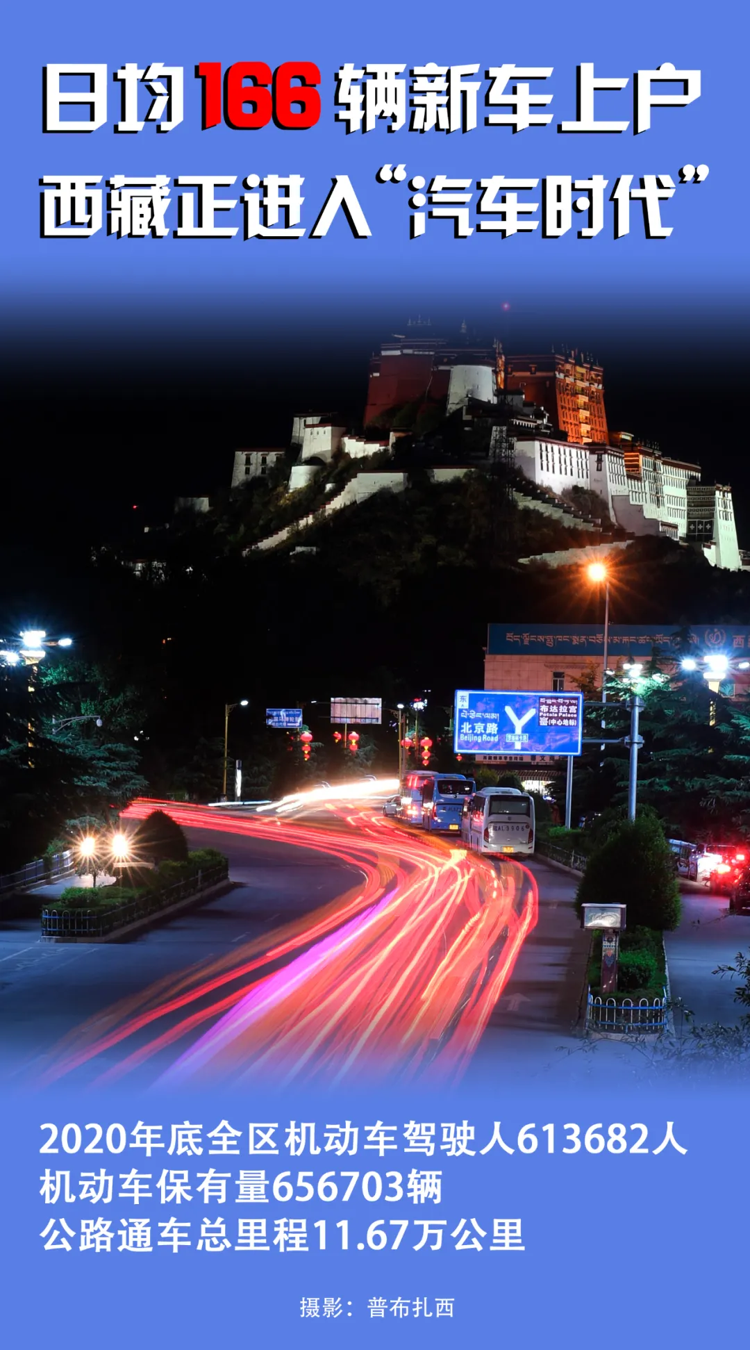 2020年,日均新車上戶166輛;截至當年底,西藏機動車保有量達到656703輛,機動車駕駛?cè)诉_613682人。西藏公路通車總里程達到11.67萬公里。按照目前拉薩戶籍人口55萬人計算,基本上平均每兩個人就擁有一輛車。