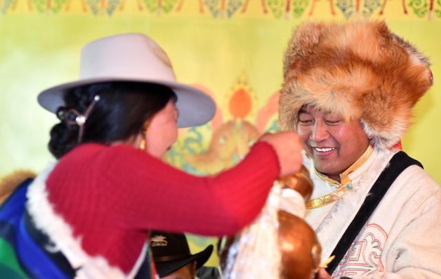 2月12日,拉薩市當雄縣牧民互相敬獻青稞酒。新華社記者 覺果 攝