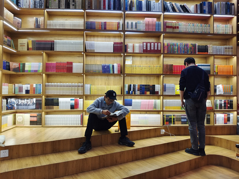 傍晚7點,在萬達廣場的“央喜書吧”里,與朋友約好吃飯的市民拉姆趁著朋友還沒到,抽空選購著書籍;