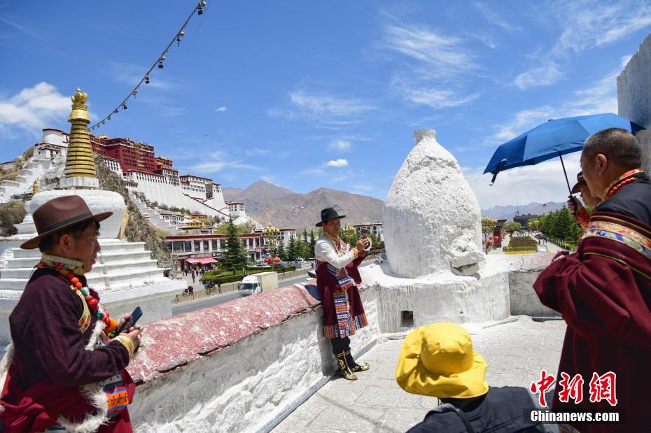 圖為4月29日,游客在拉薩藥王山觀景臺身著藏族傳統(tǒng)服飾拍照留念?!?中新社發(fā) 貢嘎來松 攝