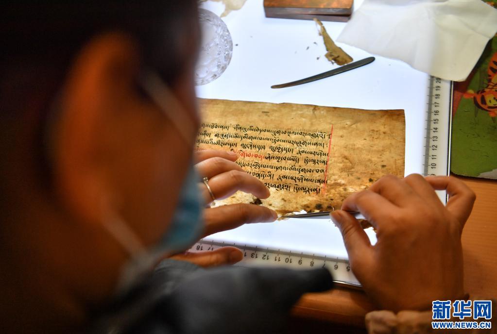 央拉正在檢查一葉修復(fù)中的瀕危藏文古籍。(資料照片 晉美多吉攝)