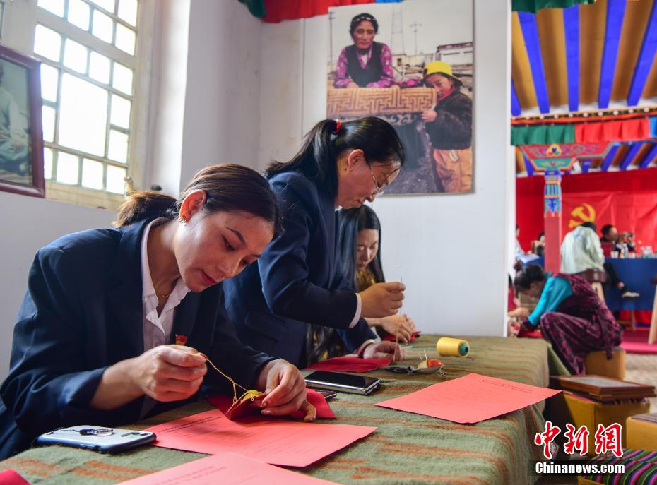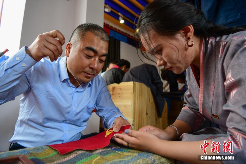 圖為西藏自治區(qū)民辦職業(yè)技能培訓學校行業(yè)黨員縫制黨旗。貢嘎來松 攝