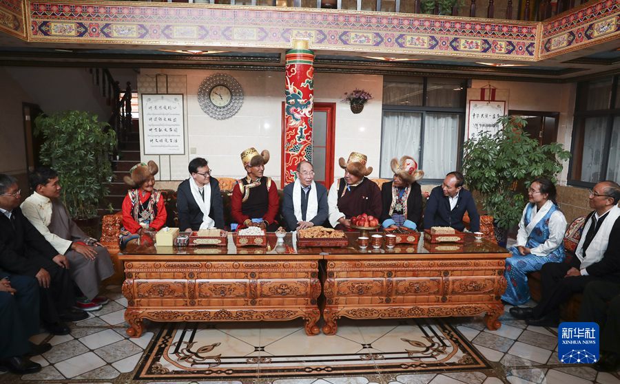 8月20日,中央代表團山南、日喀則分團帶著以習近平同志為核心的黨中央的深切關懷和全國人民的深情祝福,分別看望慰問當?shù)馗髯甯鹘绺刹咳罕?。這是中共中央書記處書記、中央統(tǒng)戰(zhàn)部部長、中央代表團副團長尤權(quán)率山南分團在山南市乃東區(qū)昌珠鎮(zhèn)扎西曲登社區(qū)走進居民次仁家看望慰問。新華社記者 丁林 攝