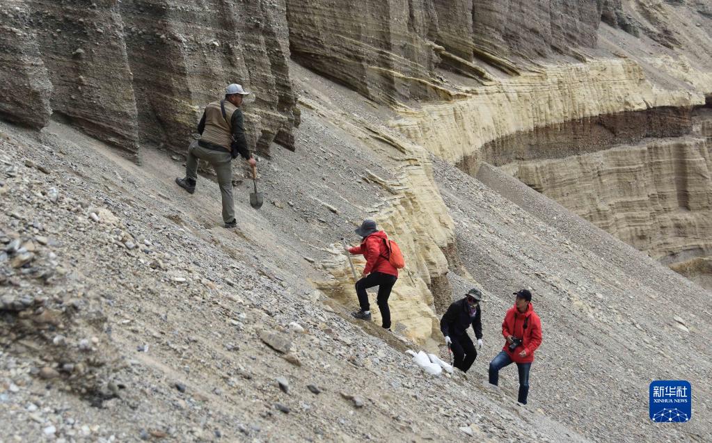 8月27日,科考隊員在西藏日喀則市定結(jié)縣一個垂直地面的沉積剖面工作。新華社記者 杜剛 攝