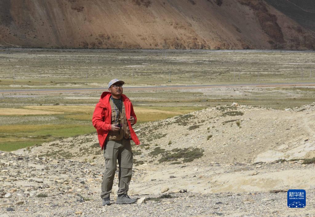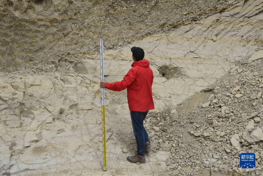 8月27日,在西藏日喀則市定結(jié)縣一處山體,科考隊員郭劍使用標尺,測量湖相沉積物厚度。新華社記者 杜剛 攝