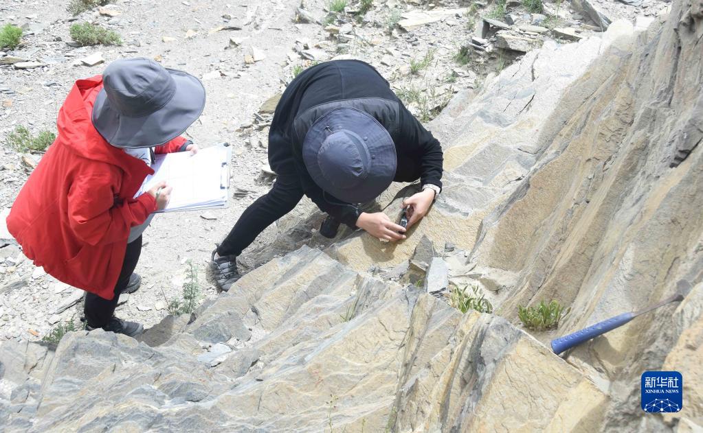 8月21日,在西藏日喀則市一處山體,科考隊員使用地質(zhì)錘、羅盤等工具,進行地質(zhì)災(zāi)害鏈科考工作。新華社記者 杜剛 攝