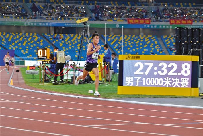 在同日進行的田徑項目男子10000米決賽中,西藏自治區(qū)選手多布杰、索朗才仁、旦木真次旺參賽。經(jīng)過激烈鏖戰(zhàn),多布杰以28分35秒24的成績力壓群雄,勇奪冠軍,為西藏奪得本屆全運會第二金,蟬聯(lián)兩屆全運會該項目的冠軍。旦木真次旺和索朗才仁分別獲得了第四、第七名的好成績。