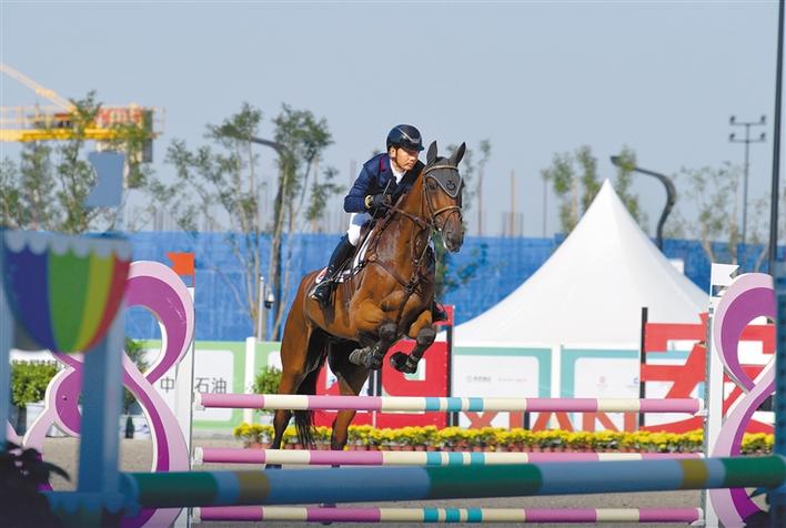 西藏自治區(qū)選手在進行馬術三項賽團體賽的最后一項比賽場地障礙賽。