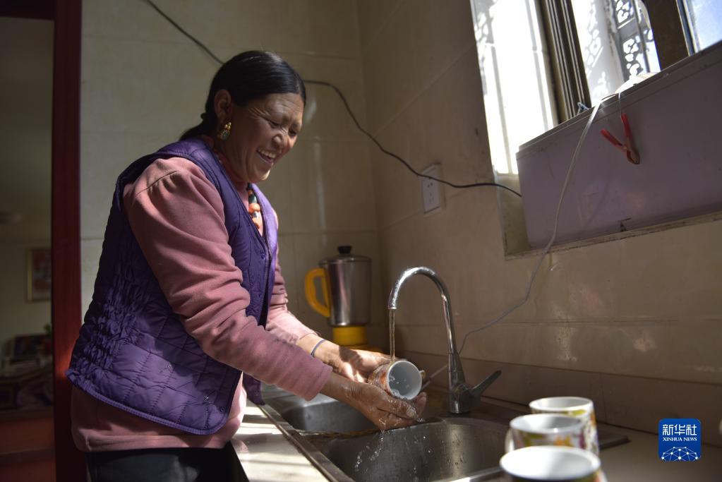 楚魯松杰鄉(xiāng)楚松村楚魯組村民強(qiáng)白桑姆用入戶自來(lái)水清洗茶碗(2021年9月18日攝)。新華社記者 格桑朗杰 攝