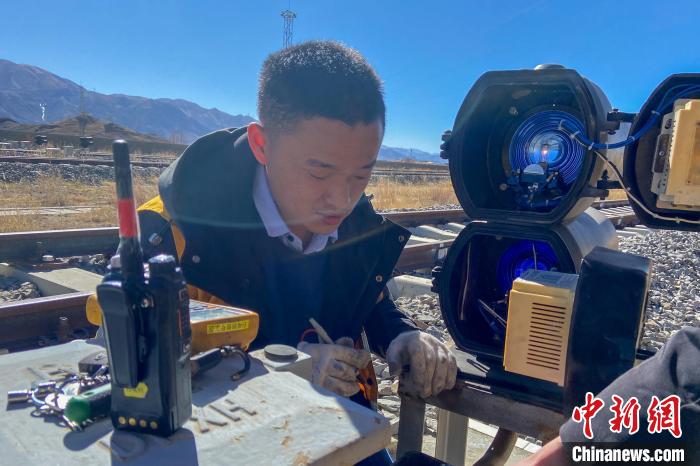 圖為劉興文在拉日鐵路測試信號機電燈電壓?!⊥鮼睚垺z