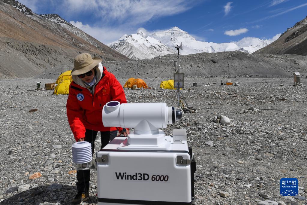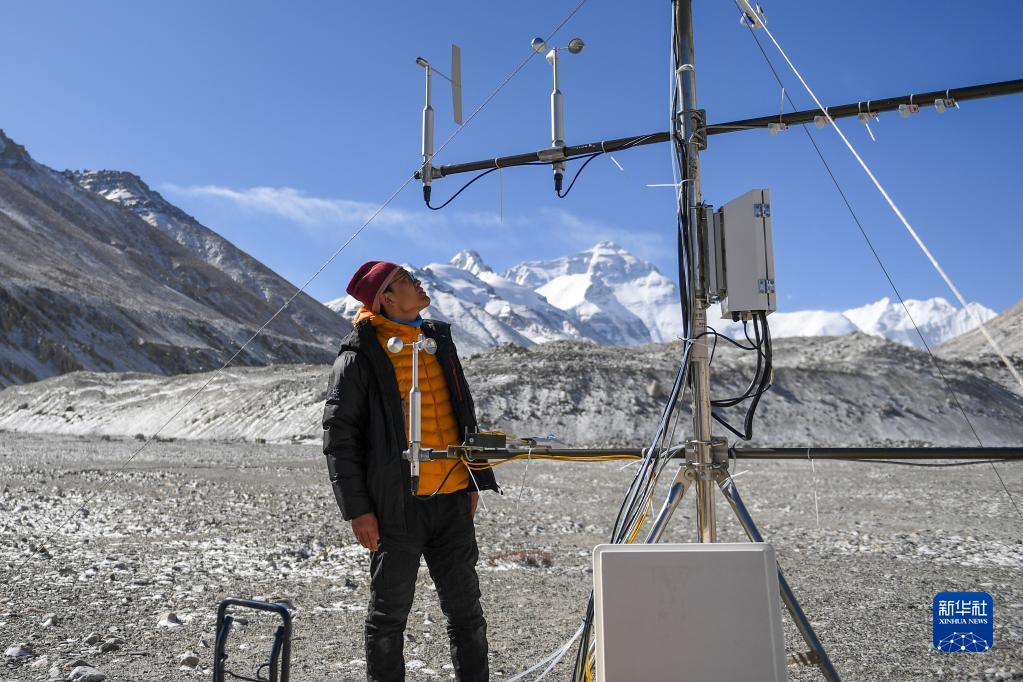 5月3日,在珠峰登山大本營,科研人員檢查臭氧通量裝置運行情況。新華社記者 姜帆 攝