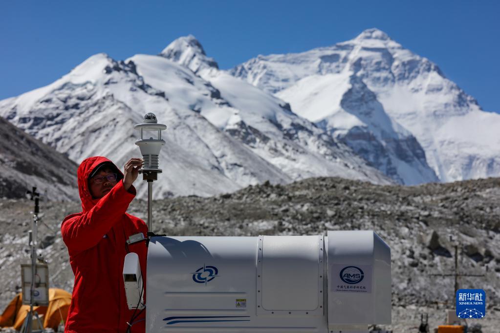 5月3日,在珠峰登山大本營,科研人員檢查微波輻射計。新華社記者 姜帆 攝