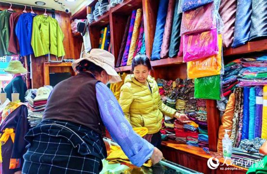 進入旅游旺季后,來自天南地北的游客到拉薩八廓古城賞民俗品文化,位于八廓街上的朵究倉藏裝店也因此成了必備網(wǎng)紅打卡店?!拔以谛侣劺锟吹娇倳泚磉^你們店,所以專門過來的,想買一身藏裝作紀念,老板你幫我看看哪件合適?”來自東北的吳女士邊挑選衣服邊說。