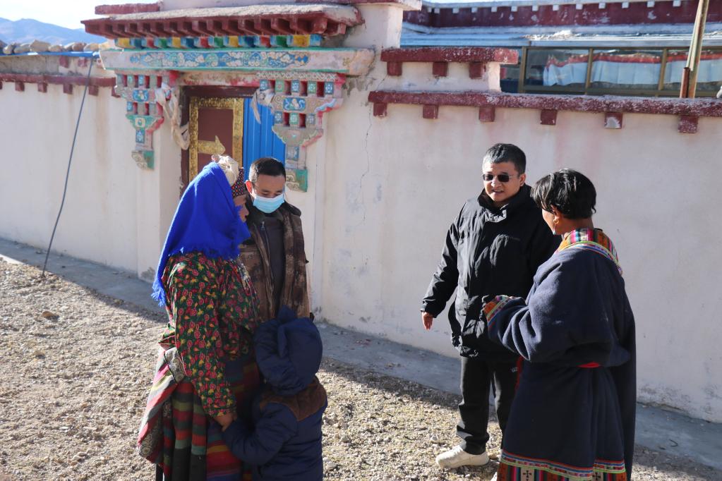 王軍強(qiáng)(右二)在申扎縣巴扎鄉(xiāng)結(jié)對幫扶戶達(dá)吉家中了解生活情況。(圖片由申扎縣委宣傳部提供)