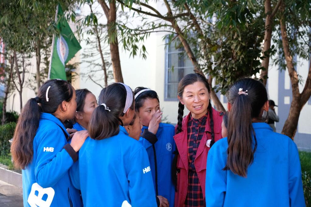 劉斯(著紅衣者)與昌都市卡若區(qū)第二初級(jí)中學(xué)學(xué)生一起探討交流學(xué)習(xí)。(受訪者供圖)