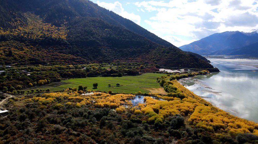 進(jìn)入深秋,西藏多地已飄下皚皚白雪,米林則依然保持著“雪域江南”的底色,在低海拔地區(qū)甚至還可以找到盛開的小花;往上,就是秋的顏色,豐茂的樹林鑲嵌著縷縷金黃,漸次更替;再往上,越來(lái)越多的山頂開始戴上“白色的帽子”,這是雪域高原的本色。春夏秋冬好像都在這個(gè)季節(jié)相遇。