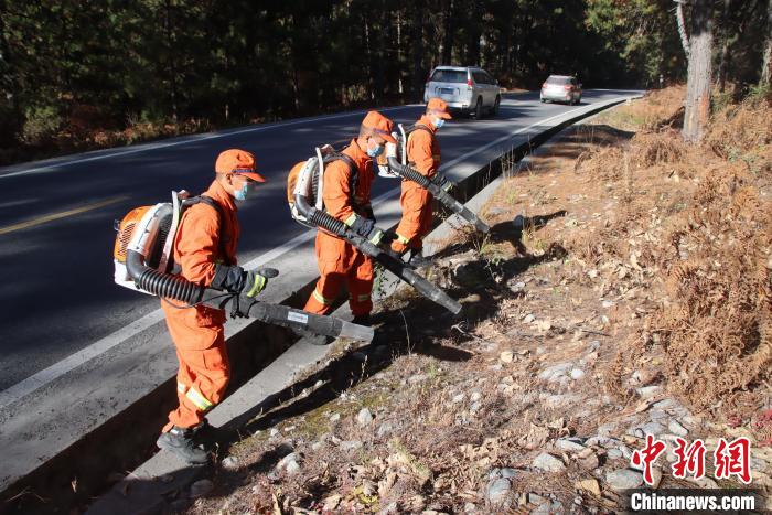 消防隊(duì)員利用風(fēng)力滅火機(jī)收攏國(guó)道旁可燃物。 王澤棟 攝