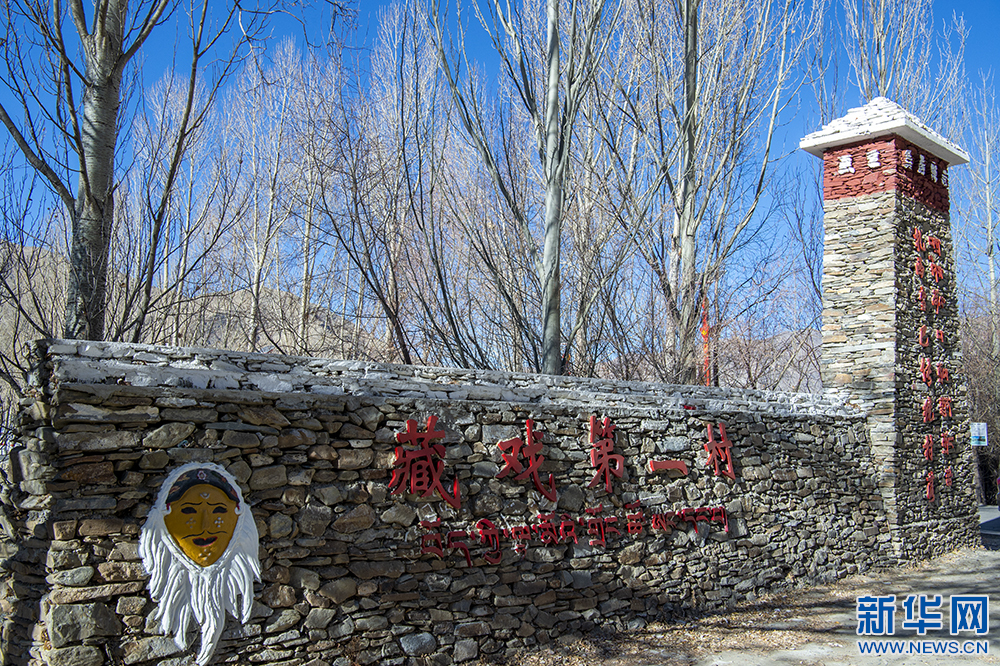圖為扎西曲登社區(qū)大門(mén)旁的雅礱扎西雪巴藏戲面具和標(biāo)語(yǔ)(12月9日攝)。新華網(wǎng) 旦增努布 攝