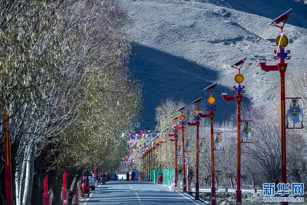 圖為扎西曲登社區(qū)街邊的藏戲主題路燈(12月9日攝)。新華網(wǎng) 旦增努布 攝