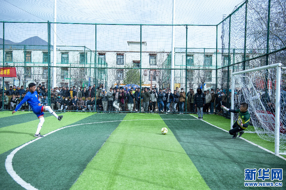 2月14日,巔炯邁瓦隊球員在點球大戰(zhàn)中射門。新華網 旦增努布 攝