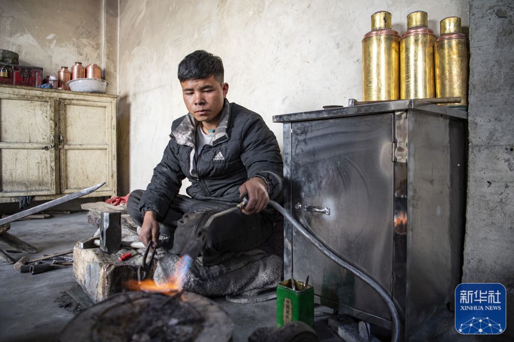 在扎西吉彩金銀銅器廠,一位手工藝人在檢查自己打制的銀器坯子(3月9日攝)。