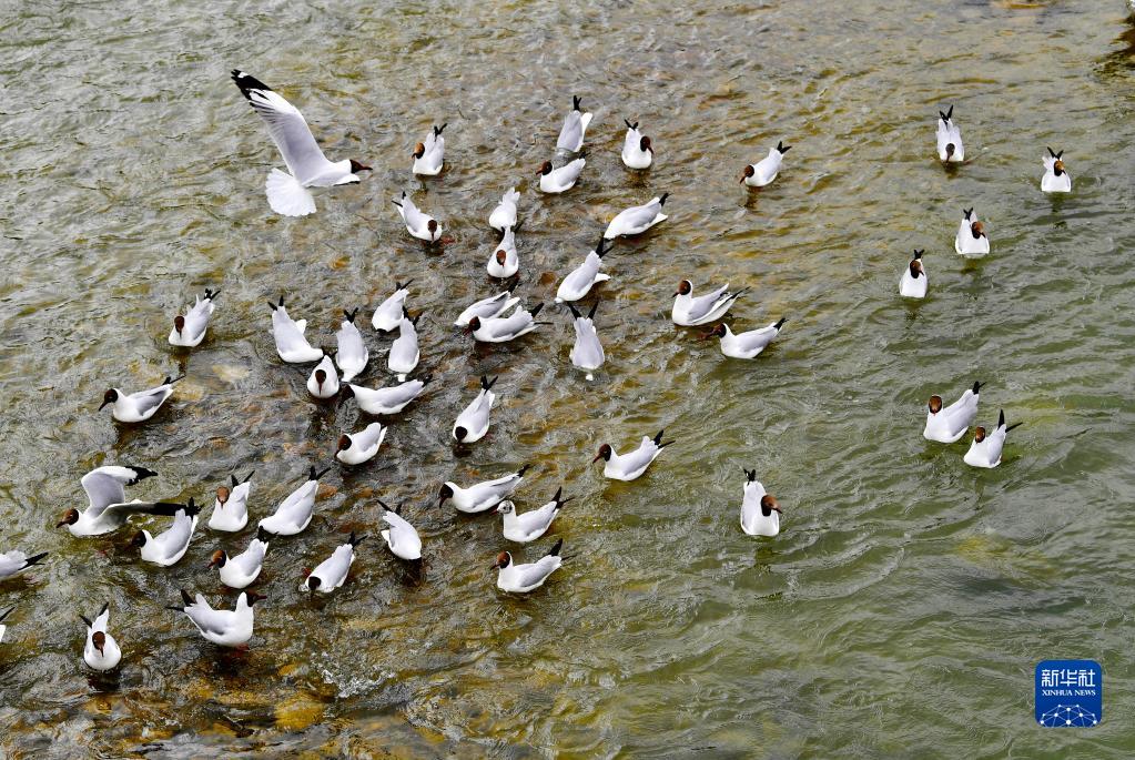拉薩河上的一群棕頭鷗(4月16日攝)。新華社記者 張汝鋒 攝