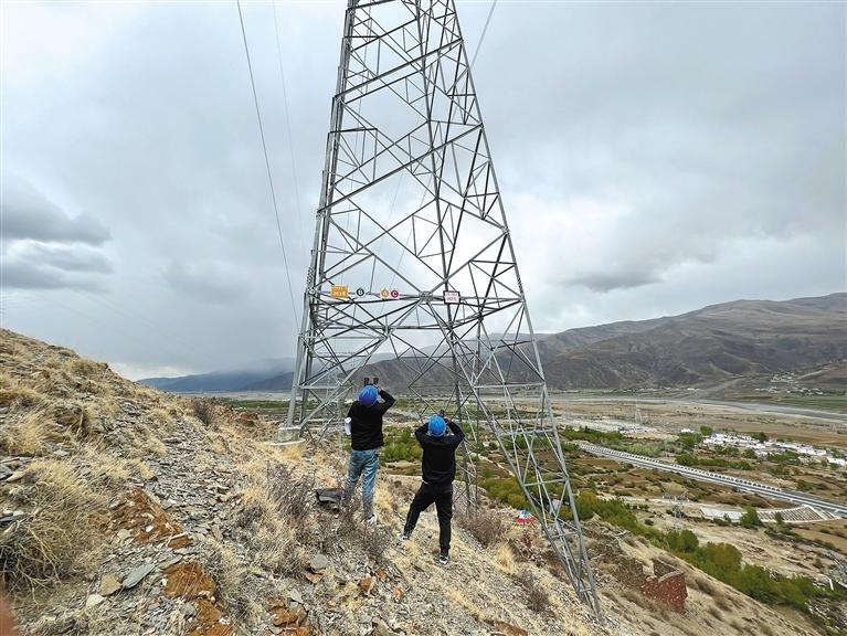 4月30日上午,國網(wǎng)日喀則供電公司輸電運(yùn)檢中心工作人員在巡檢線路。袁海霞 鄭璐 攝