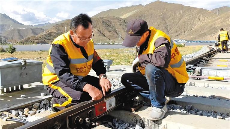 5月1日,2023年“西藏五一勞動獎?wù)隆鲍@得者劉祥斌(左)和同事在青藏鐵路拉薩工區(qū)巡檢鐵路。李洲 攝