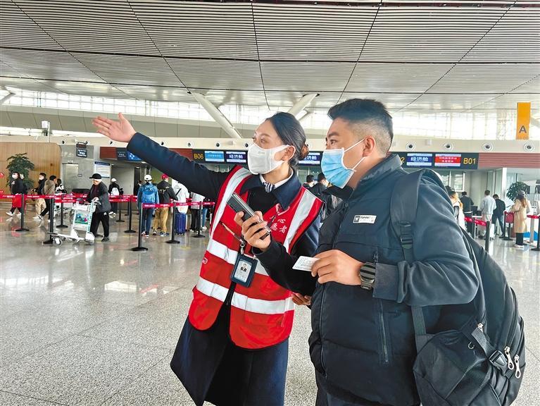 5月1日,拉薩貢嘎機(jī)場旅服部工作人員在給旅客指引方向。扎西頓珠 羅珍 攝