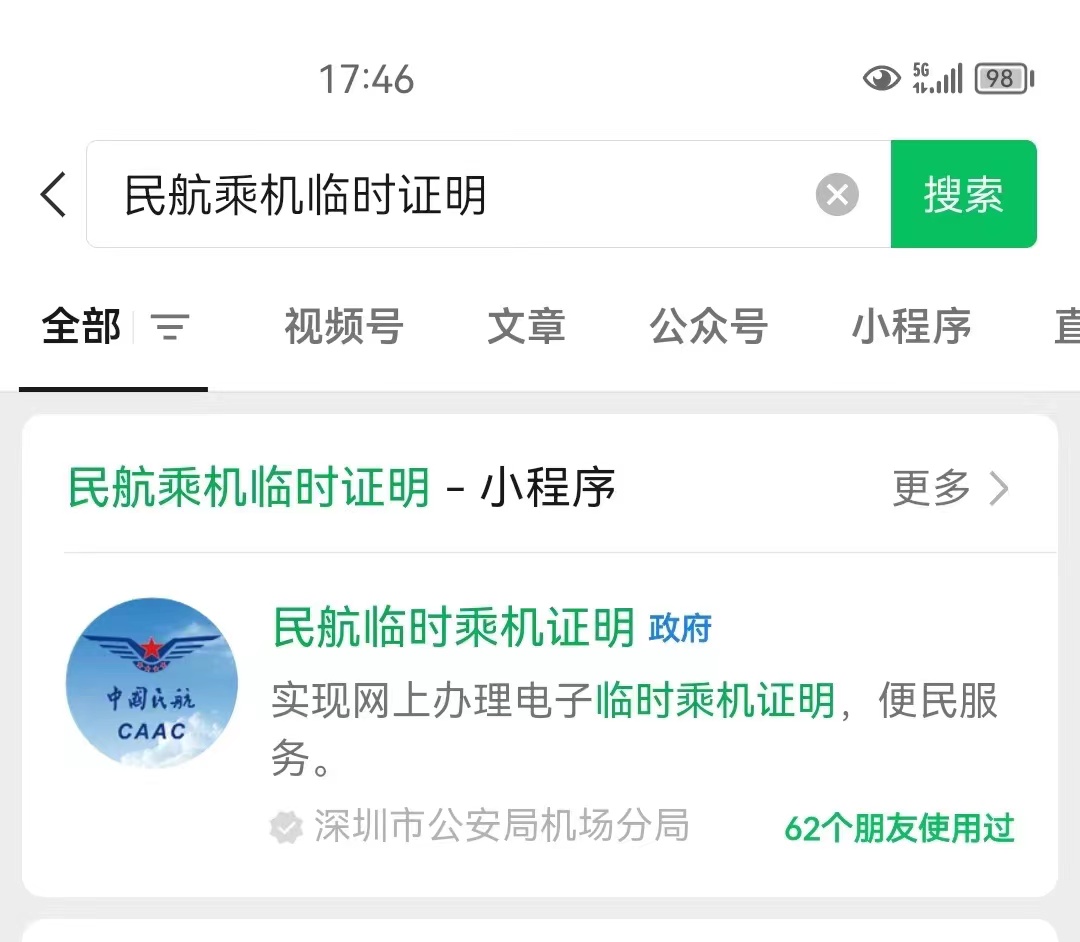 3、請(qǐng)您出示與購(gòu)票時(shí)一致的有效證件辦理乘機(jī)手續(xù),以免因證件不符耽誤行程。如身份證過(guò)期或丟失,您可以在微信小程序和支付寶頁(yè)面搜索“民航臨時(shí)乘機(jī)證明”小程序進(jìn)行辦理。