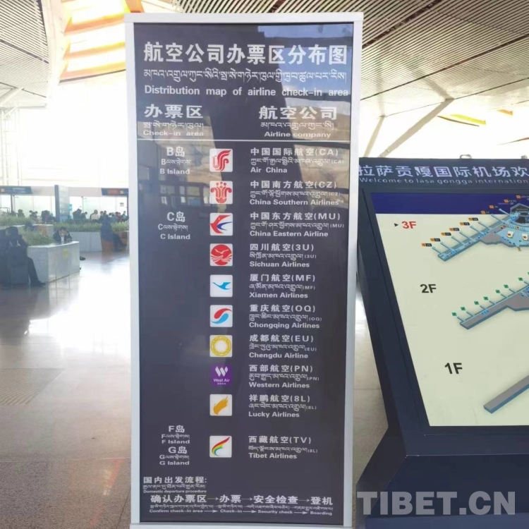 無(wú)托運(yùn)行李的旅客持個(gè)人身份證(或有效證件)前往自助值機(jī)區(qū)打印登機(jī)牌。有托運(yùn)行李和中轉(zhuǎn)聯(lián)程航班的旅客前往人工柜臺(tái)辦理。其中,乘坐西藏航空公司航班的旅客進(jìn)入出發(fā)大廳后左轉(zhuǎn)前往F、G島辦理乘機(jī)手續(xù),其他航空公司的旅客請(qǐng)前往B、C、D島辦理乘機(jī)手續(xù)。