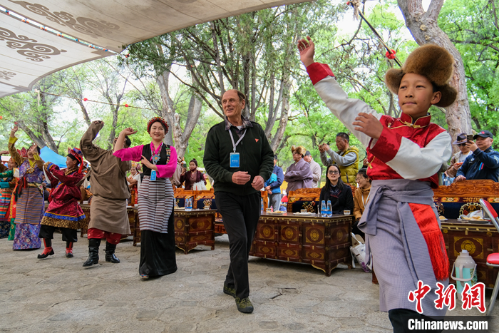 圖為5月19日,柯馬凱在拉薩羅布林卡聽(tīng)藏戲,和當(dāng)?shù)夭刈迕癖娨坏捞伹f舞。中新社記者 江飛波 攝