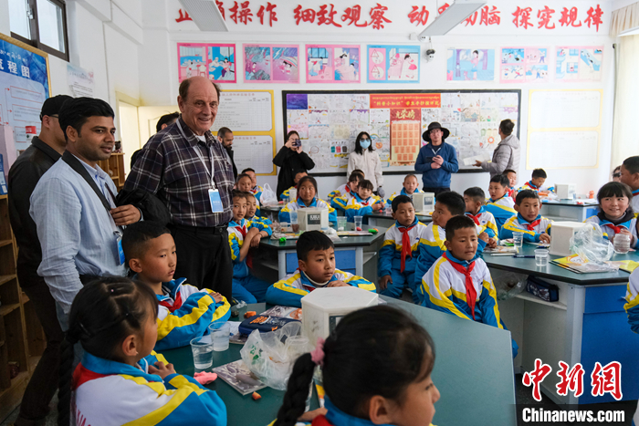 圖為5月18日上午,參訪(fǎng)團(tuán)成員在林芝市第二小學(xué)觀看孩子們上實(shí)驗(yàn)課。中新社記者 江飛波 攝
