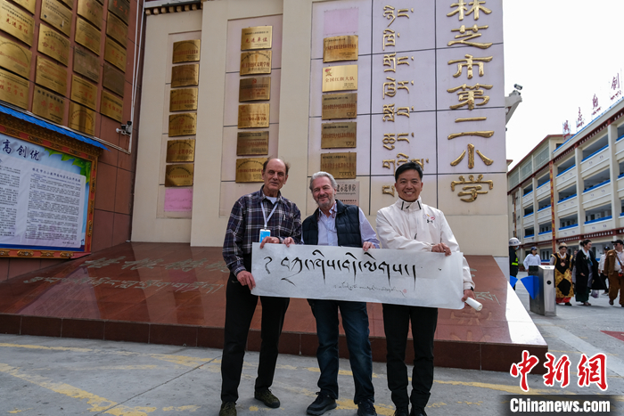 圖為5月18日,柯馬凱(左一)在林芝市第二小學(xué)參訪(fǎng)時(shí)獲得學(xué)校贈(zèng)予的藏文書(shū)法作品“扎西德勒”。中新社記者 江飛波 攝