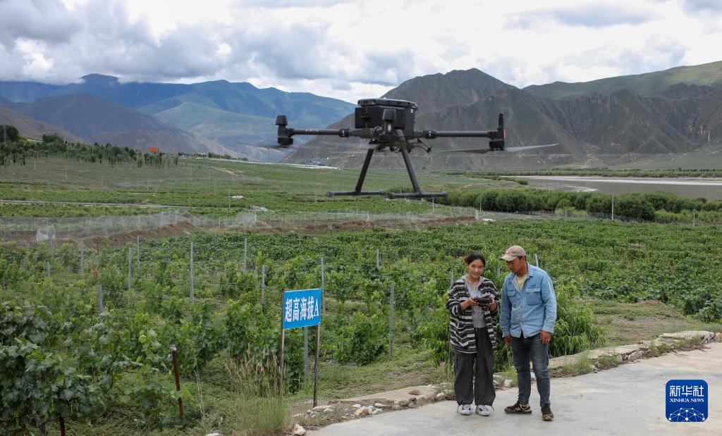 7月26日,桑日縣一家葡萄酒企業(yè)的員工曲珍(左)在葡萄園里向技術員何志榮學習使用農用無人機。新華社記者 姜帆 攝