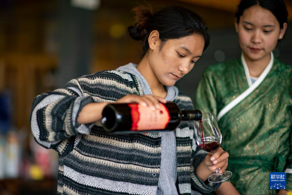 7月26日,桑日縣一家葡萄酒企業(yè)的員工曲珍(左)在跟同事一起練習企業(yè)葡萄酒產品介紹。新華社記者 旦增尼瑪曲珠 攝