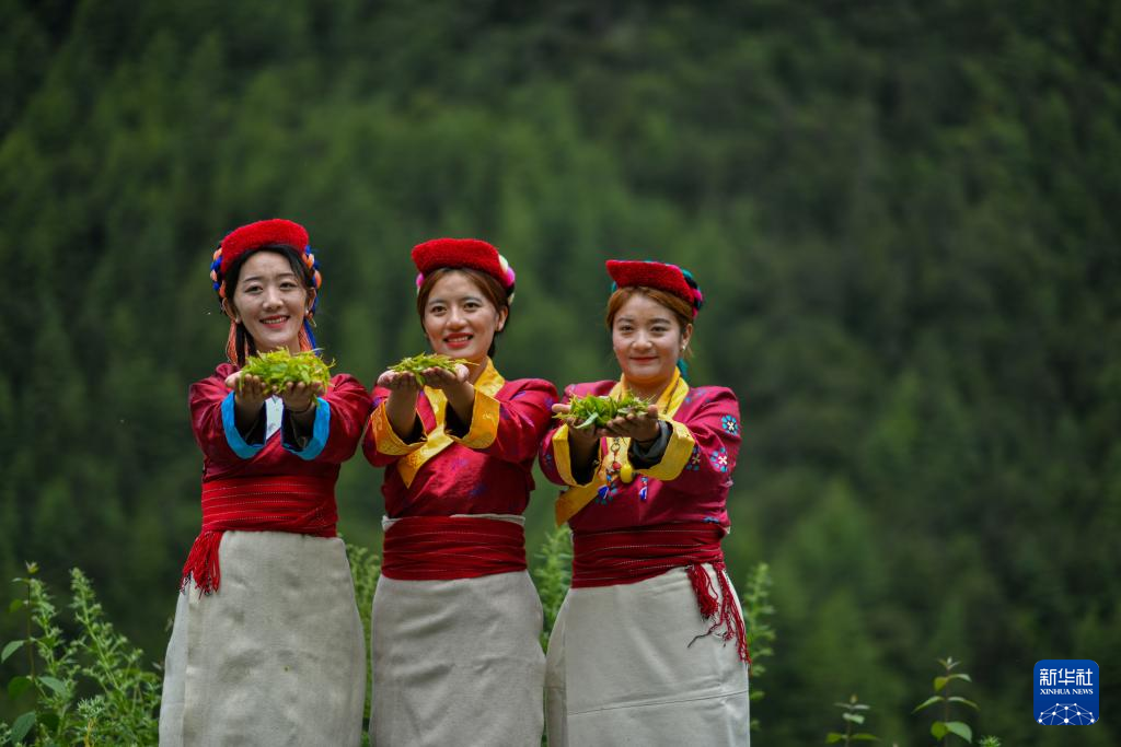 尼瑪卓瑪(右)與村民一起品嘗新制成的莓茶(7月28日攝)。新華社記者 姜帆 攝