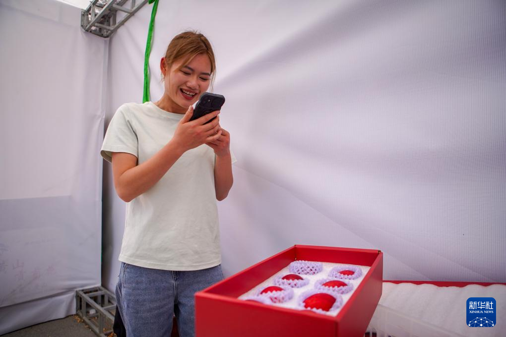廖小明正通過網(wǎng)絡直播銷售“高原紅”蘋果。新華社記者 邵澤東 攝