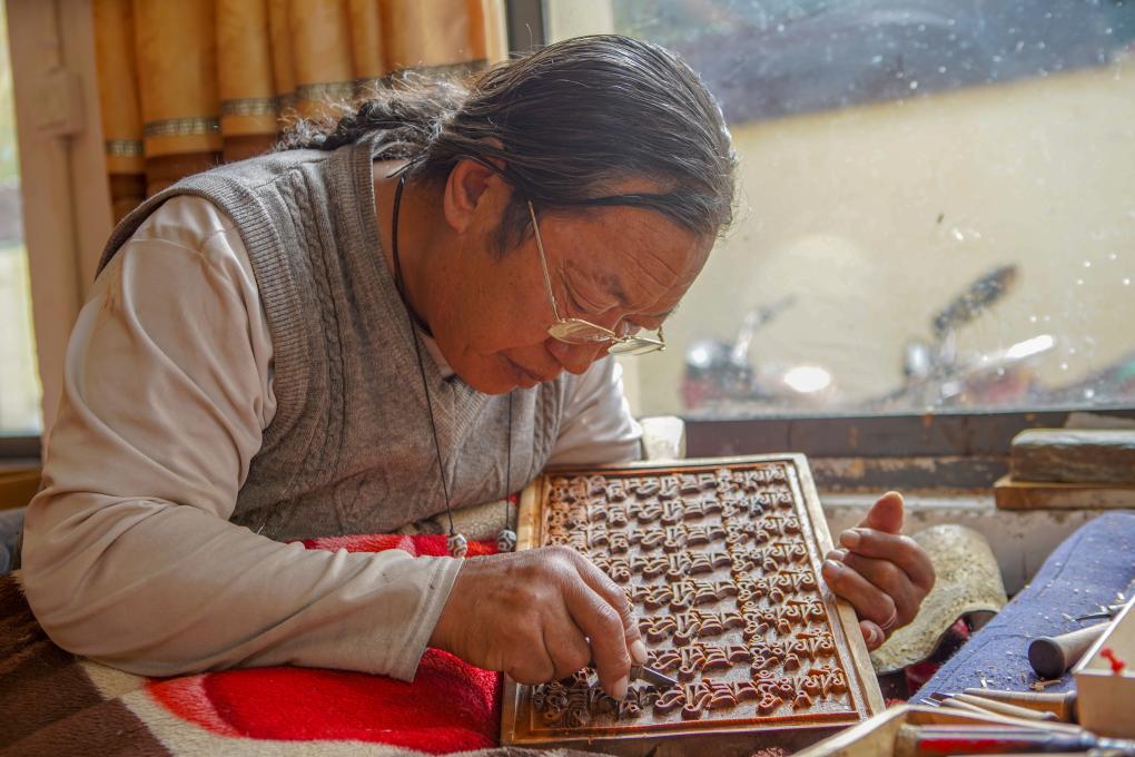 一手緊握刻刀,一手托住木板,刀起刀落間,木屑剝落,一件件樣式精美、色澤瑩潤的雕刻成品躍然眼前。在西藏昌都市江達(dá)縣波羅鄉(xiāng)外沖村,“波羅古澤刻版制作技藝”國家級(jí)傳承人澤培正在認(rèn)真指導(dǎo)學(xué)徒制作木刻。