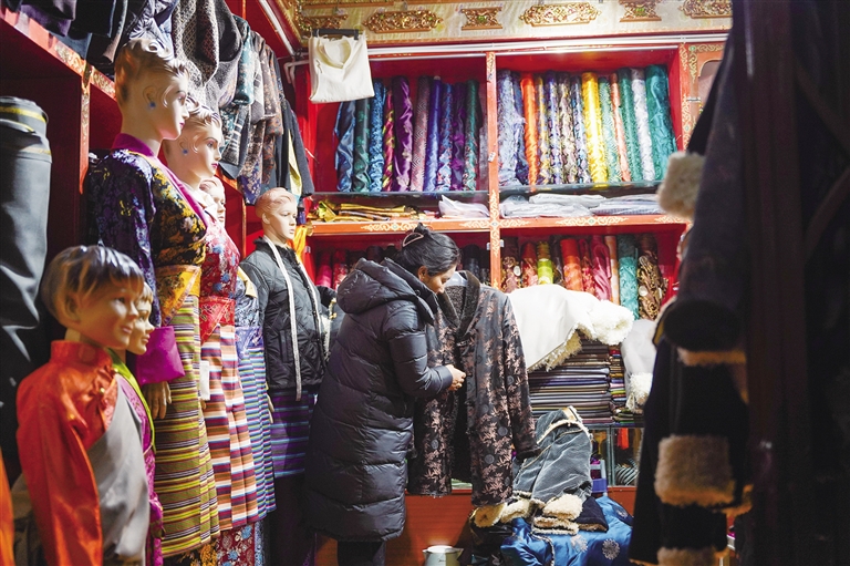 藏裝具有悠久的歷史,也在不斷演變、發(fā)展和豐富。過去人們穿的大都是氆氌織成的藏裝,樣式比較單一,清洗也不太方便。而隨著生活水平的提高,真絲面料、改良款等兼具民族特色與時尚色彩的新式藏裝深受人們的喜愛?!皞鹘y(tǒng)藏裝穿起來比較繁瑣,所以我一般都是過年或參加婚禮時穿。日常我主要穿改良藏裝,這些藏裝既有民族特色,又緊跟潮流,設(shè)計有新意,我很喜歡?!崩_市民尼瑪說。