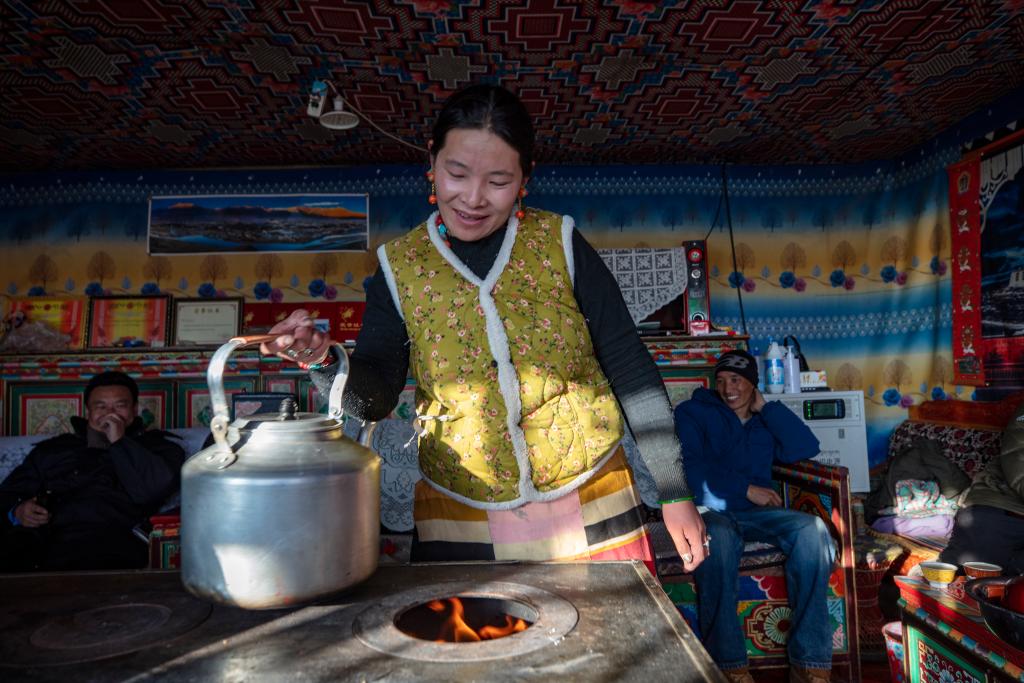 俄久鄉(xiāng)馬遷村嘎宗的家中明亮整潔,過冬的厚衣服摞在座椅上。將牛糞投入爐子中點(diǎn)燃,屋里的溫度逐漸升高。燒一壺?zé)崴?,喝一杯熱茶,屋外茫茫草原上的狂風(fēng),頓時變得不再可怕。嘎宗和女兒圍坐在爐邊,露出了笑容。