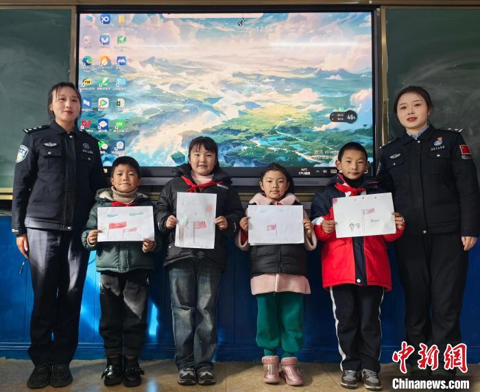 圖為玉麥邊境派出所民警與小朋友一起畫畫。扎西根培 攝
