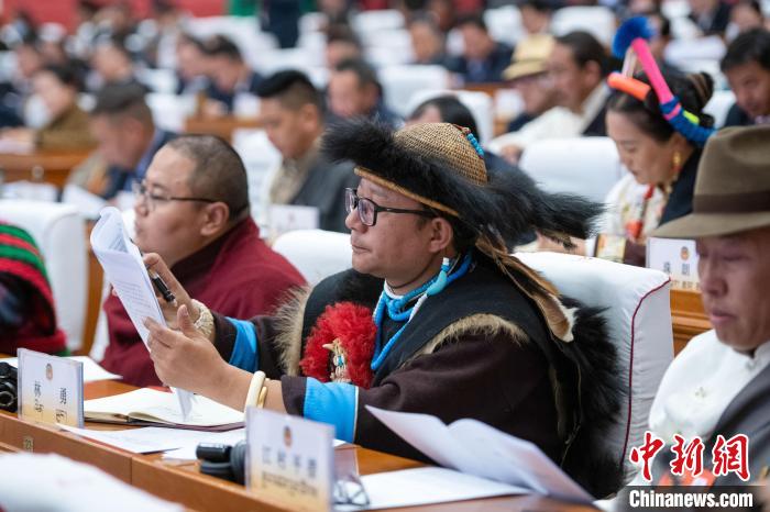 1月6日,西藏自治區(qū)兩會現(xiàn)場,珞巴族政協(xié)委員林勇(中間者)參會。中新社記者 貢嘎來松 攝