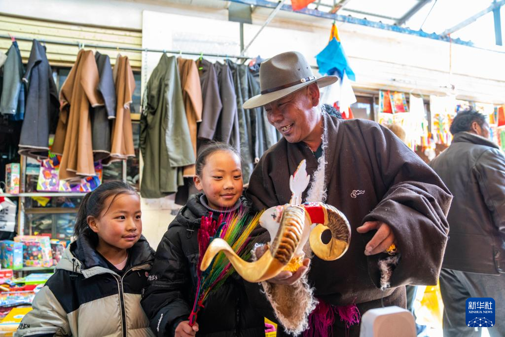 在當(dāng)雄縣的年貨市場(chǎng),索朗羅達(dá)(右)和孫女們正在選購羊頭(2月3日攝)。新華社記者 孫非 攝