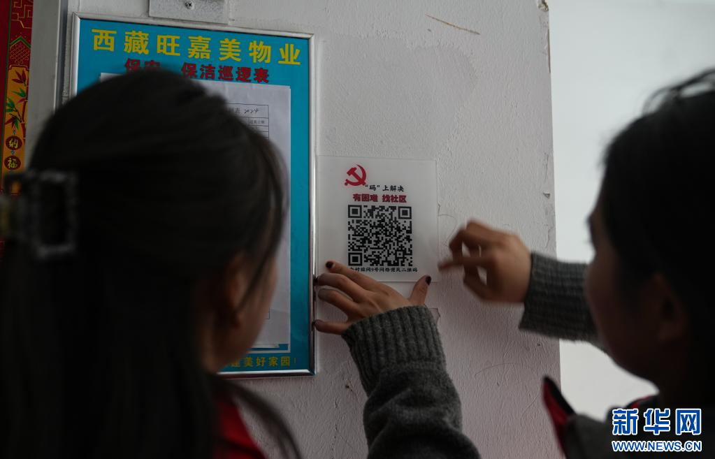 4月2日,納金村工作人員在粘貼網(wǎng)格便民二維碼。(新華社記者 晉美多吉 攝)