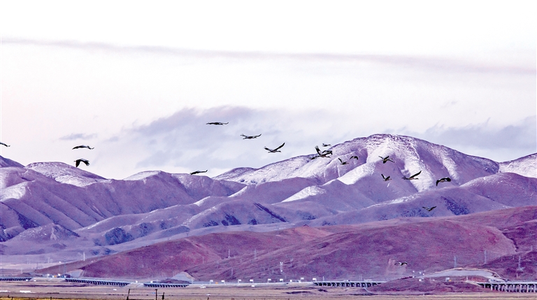 遠(yuǎn)處,有火車沿著青藏鐵路鳴笛經(jīng)過,黑頸鶴們“淡定一瞥”,仿若未聞其聲,繼續(xù)欣賞水中的倒影,于鳥鳴處處、水聲悠悠間自得其樂。當(dāng)然,也有部分遷徙北上的黑頸鶴會(huì)在此安家,孵一窩雛鳥,將這里當(dāng)作它們遷徙的終點(diǎn),開始新的生活。