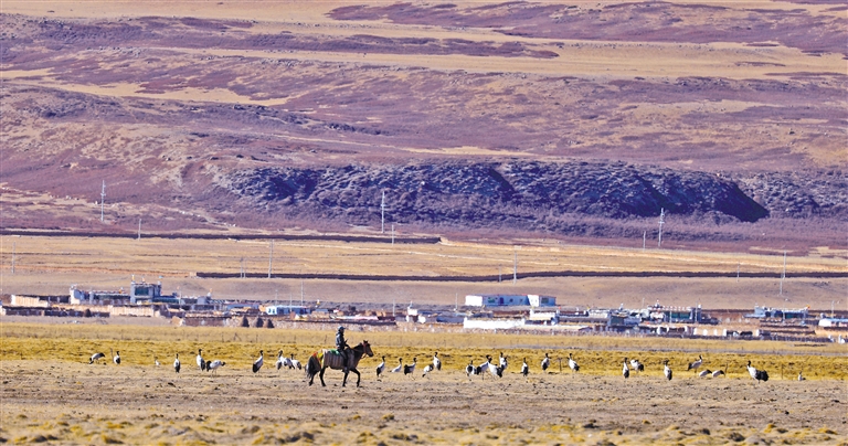 阿熱濕地內(nèi)黑頸鶴與人類和諧相處。益西旦增 攝