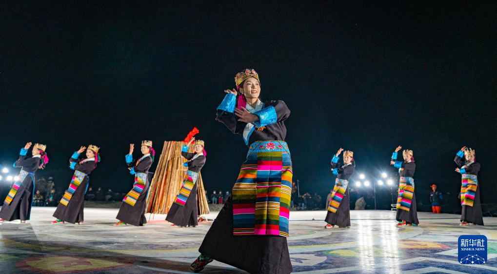 舞蹈演員在納木錯(cuò)開湖篝火晚會(huì)現(xiàn)場(chǎng)表演(5月18日攝)。新華社記者 丁增尼達(dá) 攝