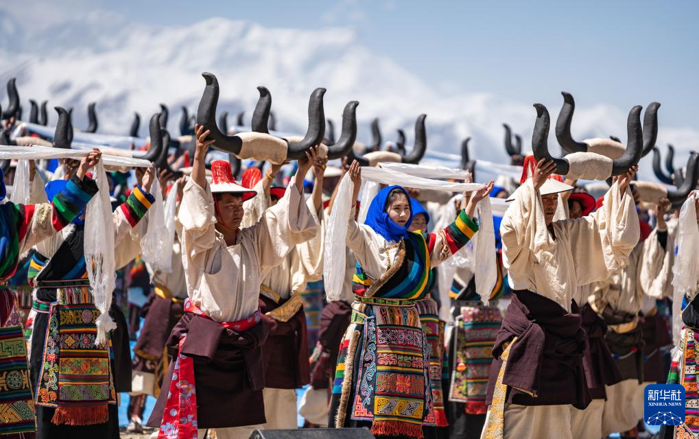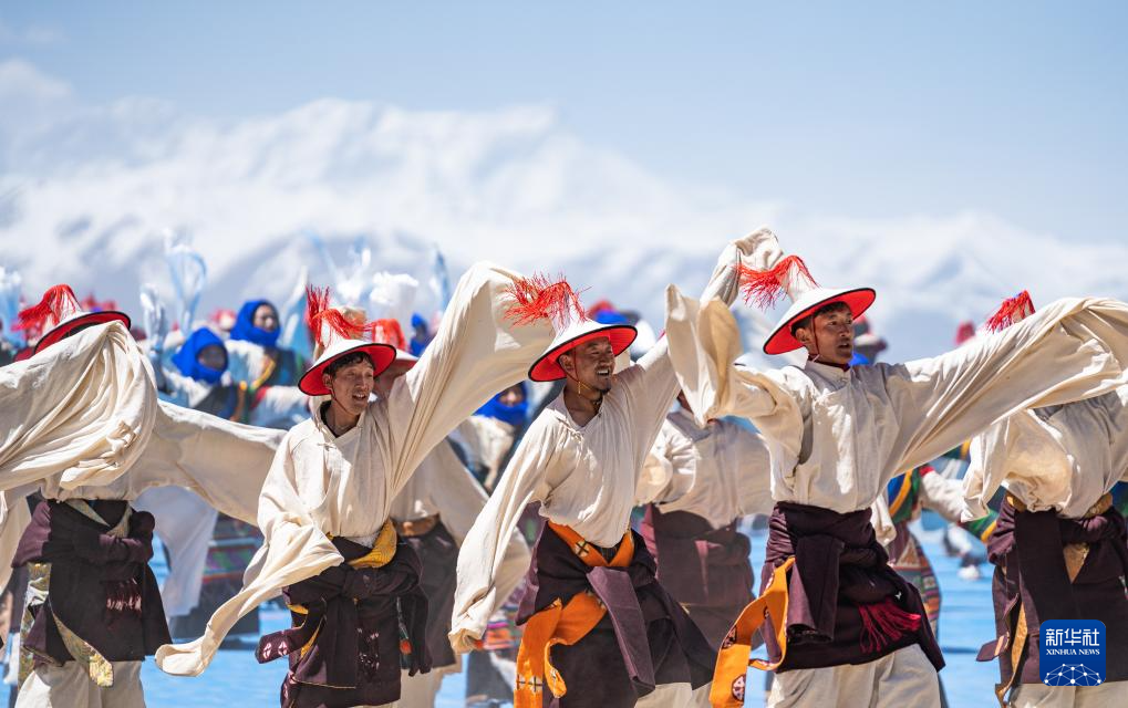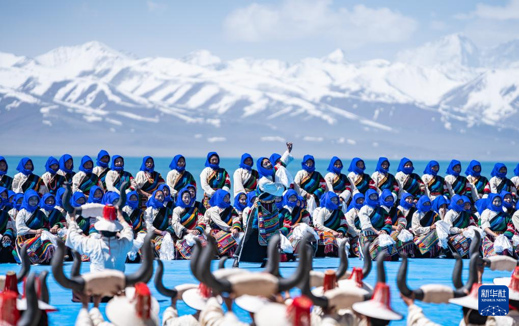 舞蹈演員正在納木錯(cuò)開湖活動(dòng)現(xiàn)場(chǎng)表演(5月19日攝)。新華社記者 丁增尼達(dá) 攝